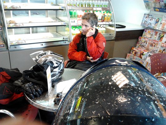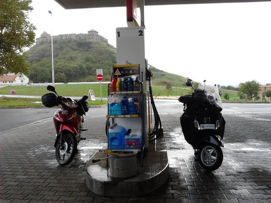 Sümegen vagyunk 5,5 óra alatt, motorokat lefújja a szel az útról, 60-70-nel megyünk max. Nekem átázott a Tucanóm, a motoros gatyám, az esőnadrágom, az alsógatyám, mindkettőnknek a kézzsákja, a kesztyűje, kútnál se száradtak meg a kézszárítón.