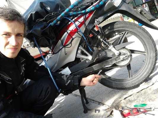 Azaz csak majdnem, mert a Szlovéniába vezető alagút előtt elkezdett valami csörömpölni a Hondán. 1 nap és 500+ kilométer után megnyúlt a lánc... Irány az első kút, vettünk szprét (úgyis kellett volna), megfújtuk. Igen ám, de a lánc centiket hasasodott, és sem a Wave, sem a Vespa szerszámkészletében nem volt 19-es kulcs, hogy meglazítsuk a hátsó tengelyt. Nem, még az én vész-szerszámaim közt se. Végül egy helyi Honda HR-V-s segített ki.