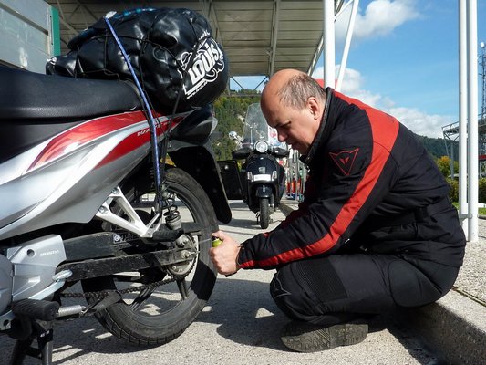 Mivel nincs türelmem tökéletesíteni a technikát, és kedden egész nap szakadó esőben mentünk, a mai első programpontunk a láncállítás és -ápolás volt. Az első szlovén benzinkúton derült ki, hogy a Hondához nem adnak megfelelő szerszámokat – konkrétan a tengely meglazításához szükséges 19-est. Segítségünk szerencsére hamar akadt, került lánckenő spray is, így a következő szakaszt a korábbinál jobban gyorsuló, kicsit nagyobb végsebességű és nem rángató motorral tehettem meg.