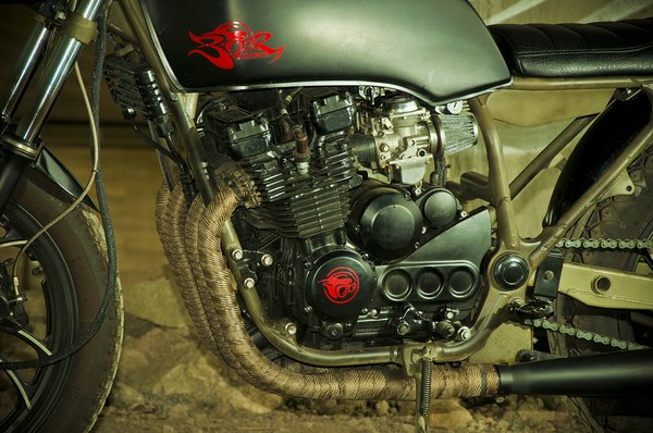 A kerekek ugyan yamahásak, de eredetileg nem ezen a gépen szolgáltak. XJ550-re gyártották őket, de ívelt száraival ezen is nagyon jól mutat. A zöldesbarna váz és a fekete alkatrészek harmonizálnak – az összképet ügyesen egészíti ki a retró mintás Mitas első gumi is.