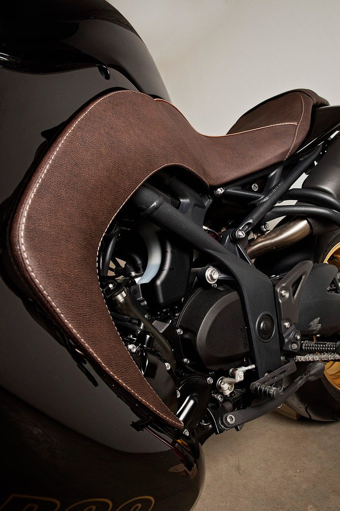 Az OZ Racing kerekek szépek, de igazából nem látványosabbak az eredetinél. Egyedül a bőr térdtámasz kelti majd fel a gyanútlan járókelők figyelmét – az biztos, hogy esőben nem kéne kinn hagyni a kistafírozott Triumph-ot.