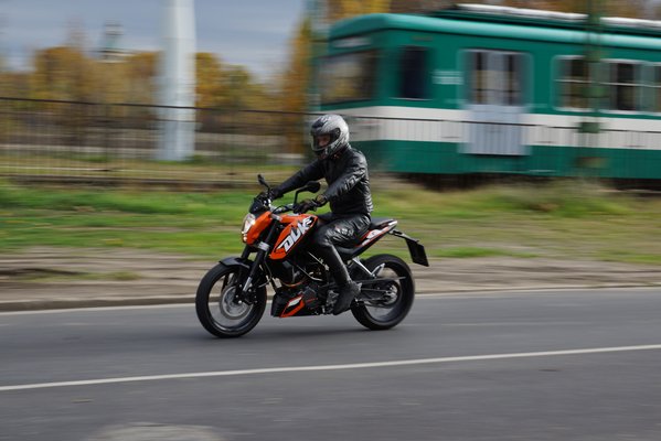 A kétszázas Duke pedig ugyanezt a fílinget hozza, csak valószínűleg nem hergeli magát párezer kilométer alatt a kéken füstölő Nirvánába, és egészen biztosan takarékosabb. Könnyű, mint egy gyerekroller, és nem is sokkal nagyobb - ezres FZR-em után mintha zsebmotoron ülnék, ennek ellenére tökéletes a támadó üléspozíció. Ezzel meg lehet tanulni döntögetni. A fékre és a vázra se lesz panasz, bőven többet tud, mint amit a kis egyhengeres kiprésel magából.