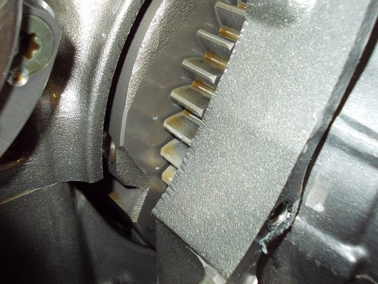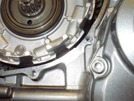 Ahogy vizsgálódtam, arra a következtetésre jutottam, hogy kizárólag a motorblokkhoz érhet hozzá, ami azért érdekes, mert hidegen 2-3 milliméteres hézag van a kosár és a blokk között. A primer hajtás nagyobbik fogaskarekének a csapágyazása nem lóg, jónak tűnik. Arra gondolok, hogy maga a kosár képes ennyit elmozdulni hirtelen induláskor amikor a kosár és a fogaskerék közötti körkörös rugók működésbe lépnek és a két alkatrész egymáson elmozdul. (Nem tudom elképzelni, hogy a fogaskerék vagy a váltótégely ekkora lógással rendelkezzen, ezt kézzel érezni lehetne, ráadásul ebben az estben nem belül hanem inkább a kosár külső széle fele érne a blokkhoz)