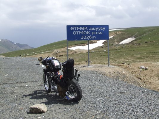 Ekkorra már 6000 km-en voltam túl, de sem hegyet, sem felhőt nem láttam. Az időjárással különös szerencsém volt, egy hónapig a párna szerepét töltötte be az esőruhám a sátorban. Kirgizisztánban aztán minden egy csapásra megváltozott. Ez jóval szegényebb ország, mint Kazahsztán, ásványkincsei nincsenek, emiatt ipara sincs, és a hátsókertemben komolyabb mezőgazdasági munka folyik, mint itt. Szerencsétleneknek nem sok vízszintes területet adott a jóisten, a kombájnban meg ugye nincs hegymeneti fokozat. Szerencsére a népsűrűség nőtt valamelyest, így már nem kellett attól tartanom, mint Kazahsztánban. Vagyis, ha lerobban a motor, már muszáj Bear Grills túlélőtechnikái után nyúlnom, és egy döglött tevében menedéket keresnem.