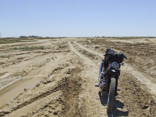 Pár nyeregtáska leszakadást követően az örömöm a 150 km-re lévő útkereszteződésben teljesedett be, ahol pár kamionos közölte, hogy itt még víz sincs nemhogy benzin. Hosszas keresgélés, és többszöri hibás útbaigazítás után végül megtaláltam az egykori kikötőt Aralskban, ahol a darukon és pár mederben rozsdásodó hajón kívül nincs semmi. A vízutánpótlás nélkül maradt Aral tó az eredeti vízfelület 8%-ára zsugorodott, és az egykori kikötőtől ma 130 km-re található a víz. Ezért a semmiért jöttem Kazahsztánba!