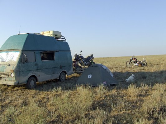 A hármas és négyes fokozat fogaskerekei pihenhettek kicsit... majdnem egy hetet. Nemsokára egy öreg VW LT-t pillantottam meg az út szélén, ami motorszállító utánfutón egy BMW-t húzott maga után. Megálltam, erre két 40-es éveiben járó német elmeháborodott hippi jött elő, akik nem kevesebb, mint 8 hónapja indultak otthonról. Később együtt táboroztunk egy porvihar szomszédságában.