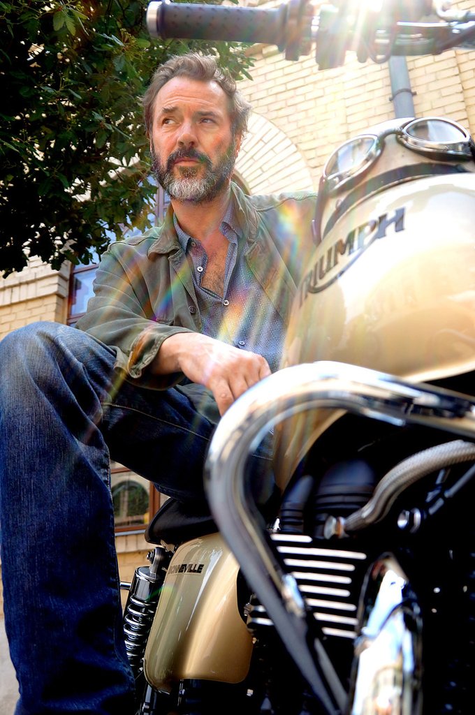 Fényképezés közben lezseren ült a fekete Bonnie-n, de a gép keresőjén át láttam, szeme máshová, jóval hátam mögé fókuszál. Hátranéztem, mögöttem kevélyen állt egy pezsgőszínű, éppen a magyar vevőre váró motor. „Mit szólnál, ha átülnék?” – kérdezte tőlem szinte bocsánatkérően. Szeme csillogott, mosollyal és nevetéssel formált ráncai megelevenedtek a kamaszos vágytól.