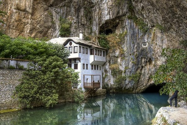 Reggel elmentünk még a kempingtől 1 km-re Buna folyó forrásához kávézni egyet, ami egyébként Európa legnagyobb forrása, másodpercenként 43 ezer literes vízhozammal. 60 m magas sziklafal alatt egy barlangból bukkan elő a türkizkék színű „kész” folyó. Mondtam reggel a többieknek, ismerek egy jó helyet kávéhoz, egy kis forrás. Közvetlen az asztalok mellett folyik el a víz, benne pisztrángok. „Na, Dinoszt ismerve, valami csordogáló mocsárhoz visz minket.” - szólt Levi. Aztán leesett az álluk...