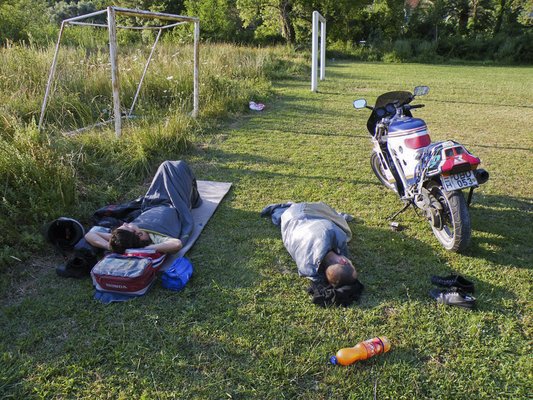 Vissza a hajóra, majd hajnalban egy focipályán találtuk magunkat. Próbáltuk hatalmas férfi agyunkkal kiszámolni, hogy ha reggel feljön a nap ki, hogy lesz árnyékban., de ez nem jött be mindenkinek. Még Dragantól kaptuk a tippet, hogy a falu focipályáján nyugodtan aludhatunk, az közterület, és különben is, reggel 7-re hozza nekünk a pálinkát. Az kicsit korán lesz koma!