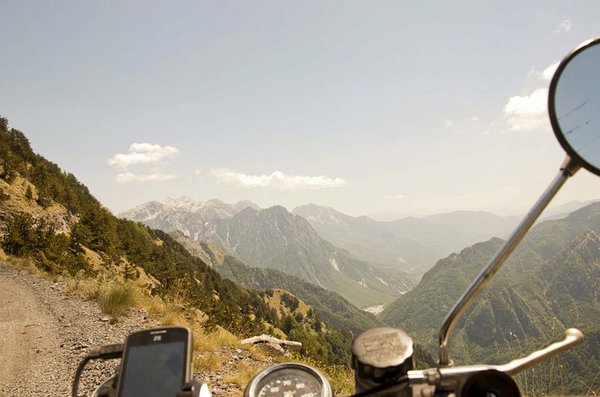 Az albán terephatáron unott őr állít meg, gyors navigálás, 70 km a célig, a Shkodrai tó partjáig. Akkor még nem gondoltuk, hogy a következő 70 kilométeren nem fogunk kettesbe kapcsolni. Irtózatos terep, sziklák, por, vízmosások, szédítő kanyonok és persze 40 fok. Szemben egy szétpakolt IFA kapaszkodik a félsávos murvaúton, kanyarban megijedek, kimegy a motor eleje és már fekszem is a szakadék szélén. Látom jön Frici is, megijed, majd mellém fekszik.