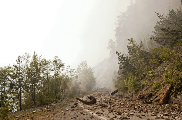 Egy jobbos kanyar után hirtelen égő barikádra lettünk figyelmesek az út közepén, és közben dinnye nagyságú szikladarabok hullottak az égből, szétrobbanva a betonon. Sosem láttunk még erdőtüzet, szóval nem kerítettünk neki nagy feneket. Egy rövid időt még áldoztunk a megfigyelésre, hogy milyen ívben szállnak a törmelékek, aztán síró kuplunggal nekivágtunk. Aztán egyre nagyobb lett a füst és közvetlenül mellettünk égtek a fenyők és dőltek az útra. Egy pillanatra azért ránéztem a GPS-re, de szerinte itt nem kellene lennie semmilyen apokalipszisnek.