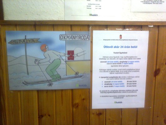 Már az előttem lévő számmal egy apuka a két kislányával állt az pultnál. Valami nem ment nekik, először a bankkártyájának nem volt jó a PIN kódja (telefonálgatni kezdett miatta), aztán az ügyintéző is visszavonult valamin dolgozni a saját meg a kolléganőjének asztalához. Eközben ugyanahhoz a pulthoz hívott a kijelző engem is, 1-1 perces késleltetéssel még további három soron következő ügyfelet is, viszont ügyintéző egyáltalán nem jött oda. Tolongás alakult ki a pultnál, amitől én is jelentősen ideges lettem. És ezen nem segített az oldalfalon eddig észrevétlenségbe burkolódzott reklámkép sem. Útlevél akár 24 órán belül, amihez csak „lassítani kell a síelőnek”.
