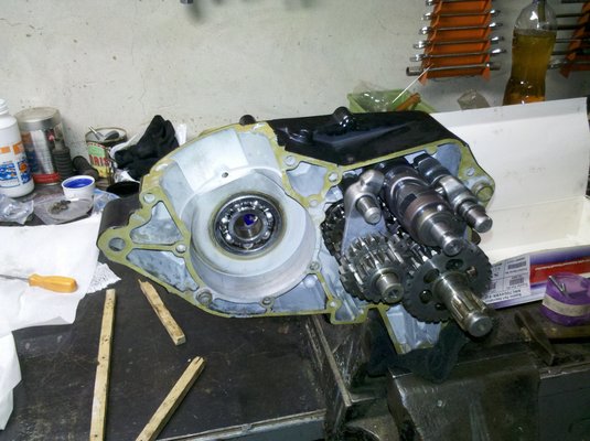 Szétszereléskor nem koncentráltam nagyon, mert két melóhely plusz vizsga nyomta a vállam, de így is simán összeállt. Illik fölírni mit és honnan szedett le az ember. Harcolnom csupán a váltó csapágyazásával kellett, mert ugye ezt melegen építjük be. Igen ám, de az a fránya lefele néz, miközben ráborítjuk a társára. Ezért amint lefelé fordítottam, kiesett. Aztán még egyszer. És még egyszer. Na ezzel eltelt a délelőtt, mire eszembe jutott, hogyha kiteszem a hidegre lehűl és helyén marad a csapágy.