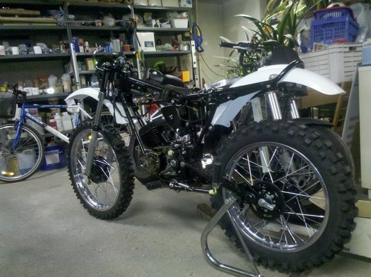 Ott hagytam abba, hogy benne az első futómű. Nos, megjött a hátsó lánckerék. Másodjára már a jó. (A bolti szakkönyv is csak az újabb DT-re emlékszik, de ez nem az ő hibájuk) Ezért bedobhattam a hátsó kereket is. Igazából csak azért, hogy megnyugodjon a lelkem, de az alagút végén nemhogy fényt nem láttam, de reményt se, olyan messze volt a cél, gondoltam. Természetesen nem így fog állni, de most új értelmet adtam a seprűnyél rugózásnak. Sokkal lejjebb lesz, akár a korabeli terepmotorok.