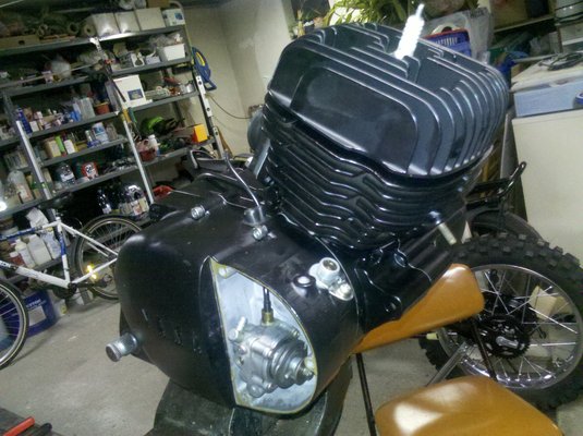 Kész lett. Ott álltam a satupad mellett egy számomra szépséges hajtóművel, mellette egy csillogó üres vázzal és csak csodálkoztam. Milyen simán ment. Gondoltam, szerencsém van ezzel a motorral. Bár mondták nekem, hogy ne vegyem meg, de nem hallgattam senkire. Ölembe kaptam és beleillesztettem a vázba, nem bírtam ki. Mondjuk ménkű nehéz volt úgy egyensúlyozni vele, hogy ne verjem le sehol a festéket.