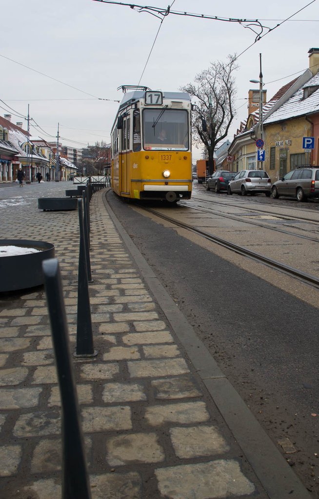 A Promenád kialakításával járt, hogy felszámolták a parkolókat, és szinte a teljes területről kitiltották a járműforgalmat. Az óbudai Fő térhez hasonlóan nem behajtást tiltó táblákat, hanem forgalomkorlátozó oszlopokat alkalmaztak. Akárhogy nézzük, drágább megoldás. Karádi Gábor vezető tervezőtől megtudtuk, ezekhez az önkormányzat ragaszkodott, rá csak a kiválasztást bízták. Kizárólag a formai szempontok voltak szem előtt, közlekedésbiztonságiak nem. A Benito spanyol formatervező cég terméke, a Neo barciono H320, vagyis alacsony oszlop, ezt teljes mértékben tükrözi is. Igaz, ha ragaszkodunk az oszlop szó geometriai jelentéséhez, akkor sokkal inkább cölöp. Egy, a földtől mérve mindössze hetvenöt centi magas, téglalap alapú, felfelé szűkülő téridom.