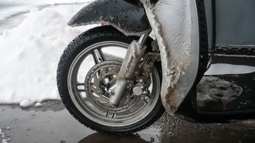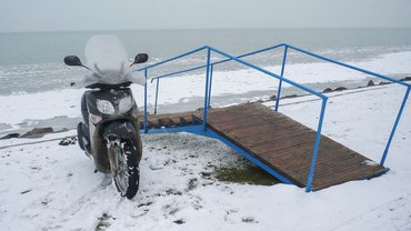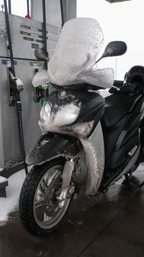 Mivel a Nimród utca nem a városi felsózás első ütemében van, kipróbáltam a robogóra extraként szerelt téli gumit, illetve az integrált fék hatásosságát, várva, hogy akkorát esem a letaposott keréknyomokon, mint az ólajtó. Nem jött össze, a gumik meglepően jól fogtak a hóban, a fék nem veszélyesebb a hagyományosnál, sokkal nagyobb fékerő kell az első kerék blokkolásához. Innen kezdve gyakorlatilag a Balatonig nem történt semmi különös. Szabályos 90-es tempóban a 7-es főúton meg Polgárdin át jutottam el az akarattyai MOL-kútig. Ez pontosan 100,2 kilométer a Sasadi útnál történt városszéli tankolástól.