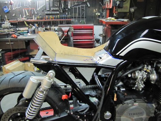 Már készen van a café racerekre jellemző fenék, szintén aluból, benne a lámpa; az ülés formáját megmutatja a kivágott papír. A gyári, kicsit eltúlzott méretű helyett egy filigrán, karcsúbb láncvédő készült.