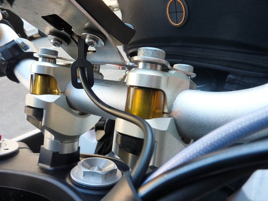 PHDS gumiágyazás fogja a kormányt, így lényegesen kevesebb remegés jut el a vezető karjához – a rossz utak rázása és a mechanikus vibrációk nélkül tovább bírják majd a nyeregben. Az R-változat színre festett bukóvasai és a Power Parts alumínium kartervédő is fontosak; kedvencem mégis a házi készítésű apró, fém szerszámos láda volt, amelyet a gyári csomagtartó és a hátsó ülés közé szabtak be.