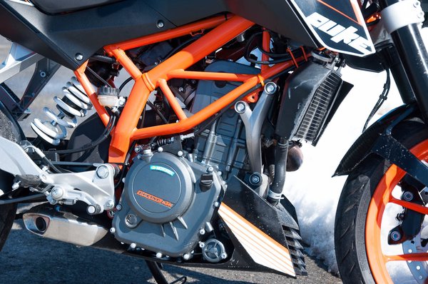 A csúcsteljesítményt 9500-nál adja le, de már 5000 fölött van élet a Duke-ban. Persze forgatni kell, hisz a lökettérfogat csak 375 köbcenti, de ez a feladat nem kellemetlen, hisz nem egy leheletnyi teljesítménylyukra vadászunk, mint az öreg kétütemű sportgépeken, hanem egy jól felépülő teljesítménygörbén emelkedünk rezgések nélkül – ha kell, tiltásig. A 125-ös és 200-as testvérmodellekkel szemben a nagyobb teljesítmény miatt ez már kovácsolt dugattyút kapott a nikasilos hengerbe.