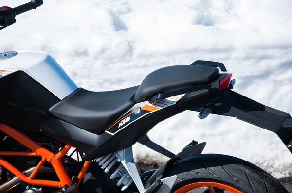 A formaterv illeszkedik a KTM-be szervesen beépült Kiska stúdió munkái közé – ezt a modellt Craig Dent rajzolta meg. Annak ellenére, hogy a Duke 390 kifejezetten kompakt, még a nagyobb motorosok is simán elférnek rajta. Az ülésmagasság 80 centi, a felsőtest picit sportos, de aránylag egyenes, míg a lábak közepesen hátra kerültek. Nem kényelmetlen hosszabb távon sem, bár az ülés tömésén én változtatnék: az ugyanolyan kemény, mint a többi nagy KTM-en, viszont ehhez a modellhez már csak kedves praktikussága okán is illene valami átlagosabb.