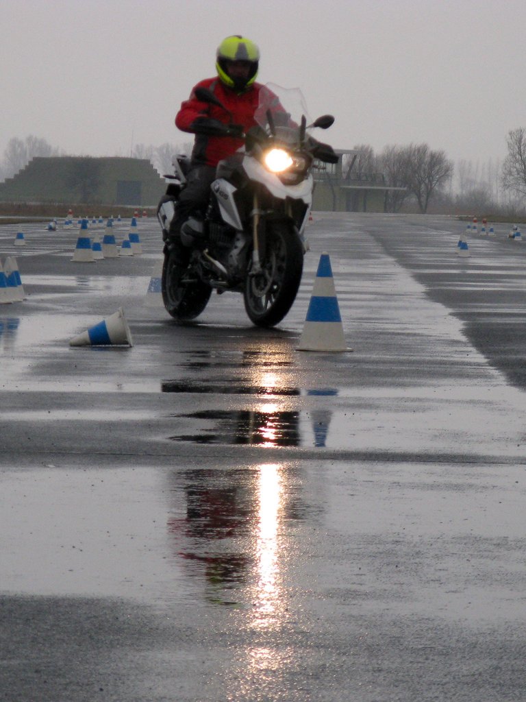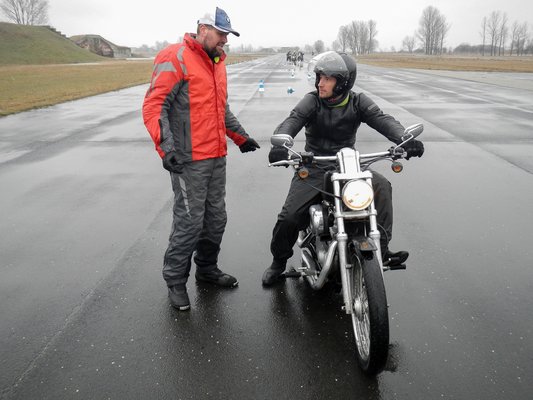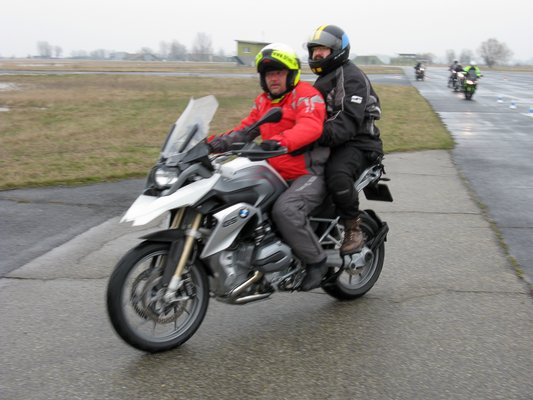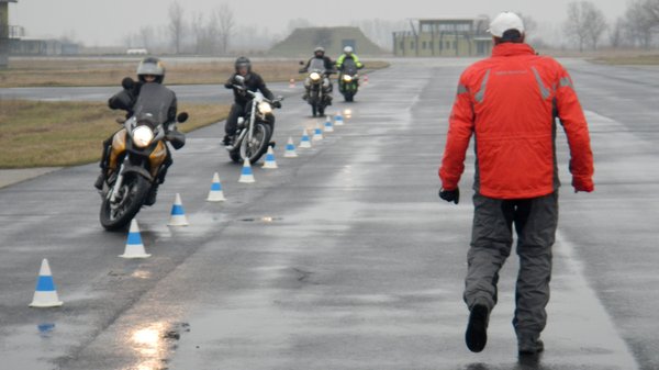 A tréningen természetesen a Driving Experience németes alapossággal kidolgozott módszereivel folyik az oktatás. A fizikát persze nem találták fel újra, nagyjából ugyanazokat a trükköket gyakorolhattam a nagymotorral, mint annak idején robogóval, de azért akadt újdonság is. A végeláthatatlan reptéri betonon bőven volt hely két bójasornak: az egyik oldalt a megszokott kis távokra kerültek az akadályok, a másikon viszont több mint tízméterenként követték egymást. Itt próbálgathattuk a nagy sebességű manőverezést az ellenkormányzásos manőverrel. Ennek a lényege, hogy a motor balra fordításához a bal oldali kormányvéget toljuk előre. Az eredmény azonnali irányváltás, a motor sokkal gyorsabban reagál, mint a testsúly áthelyezésére.