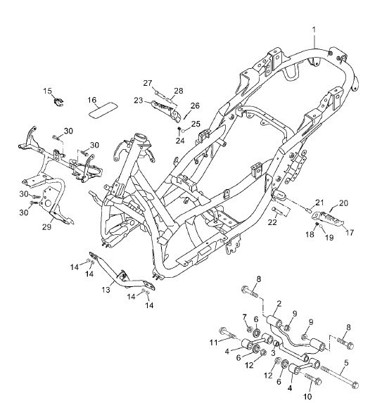Az egész robogó erősnek tűnő, masszív csővázra van építve, amely a lábtartónál kardánalagútként magaslik, azaz itt nem tudsz elvinni se egy láda almát a trepnin, se Marshall erősítőt, ellenben sportosabbá, komolyabbá teszi a külsőt. A nem csak alul, hanem felül, a burkolat alatt is futó vázcsövek enyhén térhálós megoldásért cserébe komoly szilárdságot adnak: a váz az alapköve a futómű stabilitásának.