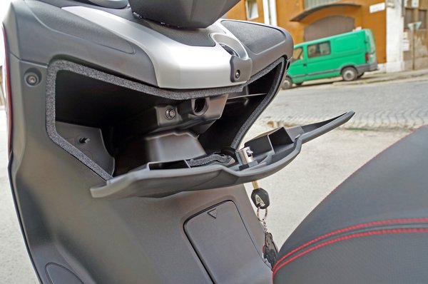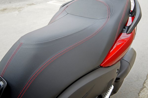 Az utasnak is bőséges helye van, ráadásul ezen a változaton egy helyes kis háttámla is található, ami általában rontani szokta az összhatást, de most nem. Az utas kényelme nem csak ezért fejedelmi, hanem a majrévas miatt is: a hatalmas kétoldali kapaszkodó a kézre eső helyet teljes mértékben átíveli. És még esztétikus is. A csomagtartó a nyereg alatt megfelelő, két sisak fér bele, de az első idomba is jutott tárolórekesz.