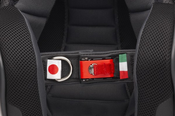 A fogazott csúszókás zár jobb és bal oldalán olasz és japán zászló található; nem feltűnő, de kedves gesztus. A kivehető, mosható bélésbe fehér Yamaha logót hímeztek, ami az üvegszálas héjra festett mintával tökéletesen harmonizál. A nagy plexi alatt egyébként kihajtható napszemcsit is találunk, praktikus megoldás. Aki szeretné, egyébként lecsavarhatja a nagy plexit – fölöslegesen azonban ne játsszunk vele, megfelelő sorrendben istencsapás visszarakni. Megpróbáltam, megszenvedtem vele.