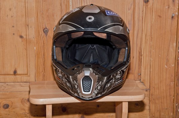 Könnyű és a belseje is strapabíró, jól tisztítható – ez elengedhetetlen egy olyan sisaknál, amit koszban használnak. A gyári napellenzőt hamar leszereltem, hisz 90 fölött már nagyon húzza a fejet miatta a menetszél. A gyári csavarokat simán vissza lehet tekerni a lyukba, nem néz ki rosszul sild nélkül sem. Kiemelném a fejtető szellőzőjét: nem kell tapogatózni semmilyen retesz után, a kutacs fölött ott egy háromszög, amit hüvelykujjal benyomhatunk, és máris van levegő. A visszazárás egy gomb megnyomására történik. Nem lehetetlen kézimunka, mint oly sok egyéb bukónál.