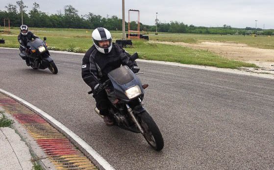 A legjobb azonban csak ez után következett, a bátorságpróba. Már a feladat is elég ijesztően hangzott: a célegyenes végén elfordulni, nagy tempónál, fékezés nélkül. „Akkor jó, ha az jár a fejedben, hogy húbazeg, ez már sok lesz” - összegezte Totti, az instruktor a lényeget. Kiderült, hogy egész hihetetlen tempóról is be lehet fordítani a motort: be kell nézni az ívre, kormánytolással le kell dönteni a gépet, és imádkozni. Mondjuk ez utóbbi nélkül is megtörténik a csoda, a kanyarodás annyit lassít a motoron, hogy a közepén már gázt kell húzni, ha nem akarunk eldőlni. Itt olyan 80-90 km/h körüli induló sebességekről lehetett szó, bár pontosan nem tudnám megmondani, én ugyanis minden motoros tréningek első számú szabályához tartottam magam: mindig oda nézz, ahová menni akarsz.