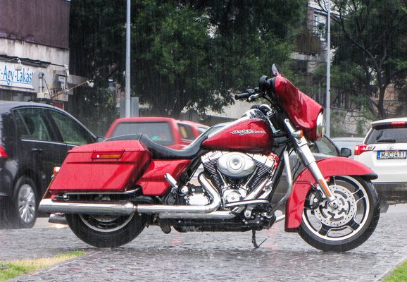 A 2013-as Street Glide pontosan ezt tudja. Nagy fejidom, de pici, füstszínű plexi, a klasszikus H-D első sárvédő alatt a megszokott 16-os helyett 18-as alufelni, nagy benzintank, öblös oldaldobozok, a hagyományos lengővillában pedig 180/65-ös gumi a 16-os alufelnin. Felső doboza nincs, és az utas feneke alá is csak egy kisebb párna jut, nem pedig óriási ülőlap, de éppen ezek miatt egészen vagány, sportos a motor kiállása. Ráadásul 25 milliméterrel alacsonyabban van a motor hasa, mint mondjuk az Ultra Classic Electra Glide-é. Van hová tennem a fényképezőgépet, az esőruhát, nem akartam, hogy egész nap egy hátizsák húzza a vállam. Kényelmes túrához ilyen gép kell.