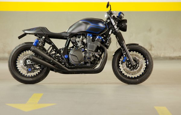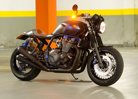 A kék kiegészítők arra utalnak, hogy a versenysportban a Yamaha kék, így kékes lett a fényezés, egy csomó csavar a kerekektől a féknyergekig, és még a hátsó, arany Öhlins tartályokat is kékre cserélték. Az eredeti XJR képét meghatározó króm palacsintasütő-lámpa helyére egy kisebb, matt fekete került. Sokk matt fekete kis kék fűszerezéssel – hatásos, visszafogott, ízlésesen gonosz. Az eredeti kapcsolók mentek a kukába, így sajnos az elakadásjelző is, ami praktikus dolog, ha az ember meg akarja köszönni egy-egy autós előzékenységét. Fekete minimálkapcsolók kerültek a kormányra piktogramok nélkül, fejben kell tehát tartanunk, hogy jobb oldalt a közelebbi a duda, a távolabbi az indítógomb, balról meg az egyik a fénykürt, a másik a reflektor. Az index és a RUN/OFF gomb egy-egy billenőkapcsoló lett, ezeket is könnyű megszokni.