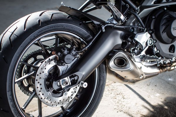 Aki szeret nagyokat és mélyen befékezni a kanyarokba (én), az hamar elkezd sziszegni, amikor a motor eleje rendre felüt az út keresztbordáin. Keményebb rugók és feszesebb nyomócsillapítás kéne ide, az én súlyomhoz legalábbis: ezeket a futóműveket sajnos a konfekcióemberekhez hangolják, akik – az MT-09 első futóműve szerint – épp szűk húsz kilóval lehetnek könnyebbek, mint én. A hátsó, központi rugóstag majdnem vízszintes helyzetben csatlakozik a lengővillához, és ugyanezek az állítási lehetőségek vannak rajta: sokkal nagyobb összhangban van a motor karakterével, mint az eleje, a visszajelzései is élénkebbek, pontosan lehetett nagy gázzal kijönni a hajtűkanyarokból. Szóval a hátulja, az nagyon ötös, az elején meg nagyon változtatnék.