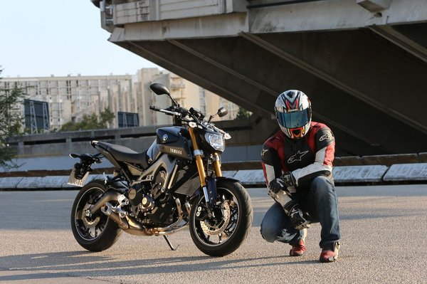 A háromhengeres motor szépen, kiegyensúlyozottan jár, viszont nagyon csendes és a hangja magas, Péter szerint nemigen fogják meghallani az autósok. A gép annyira nyomatékos, hogy országúton nem is nagyon kapcsolgatott vissza előzésekhez, hanem simán nyomta hatodikban. Nagyon jónak találta a B üzemmódot, nagyon könnyen motorozható így az MT-09, könnyű vele elindulni, nincsenek agresszív rohamai, kocsisor között is nyugodtan lehet vele mozogni. A vadabb A üzemmódban viszont harap, mint az állat, a teszten főleg ezt a kettőt használta, a harmadik – standard – üzemmódot kihagyta. Az MT-09 állati könnyen irányítható, szinte mint egy bicikli, jól dönthető, nagyon kezes.