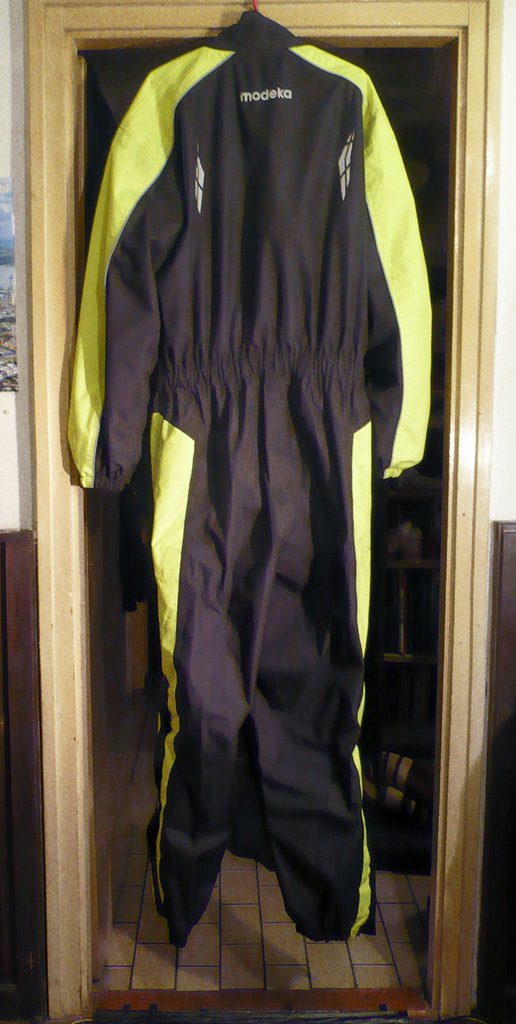 Én elkövettem azt a hibát, hogy motorosesőruhában gondolkodtam. Nem hallgattam a többiekre, nem hívtam fel Fa Nándort vagy Gál Józsefet sem. Sikerült egy állítólag német gyártású, csúcsminőségű, húszezer Ft-os Modeka esőruhába beruházni, biztonsági sárga részekkel, elegáns szabással, mely az első (!) nyolcórás, folyamatos esőzés alatt enyhén beázott a zipzáraknál, és a jobb térdénél. Itt amúgy se varrás, se más nem zavarná a vízhatlanságban. De ott feszül a térdemen és ez már elég neki. Annak ellenére, hogy a zipzárnál külön kis behajtható rész van a beázás ellen, ez alig harminc perc késleltetést jelentett mindössze.