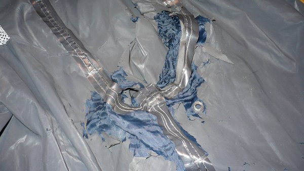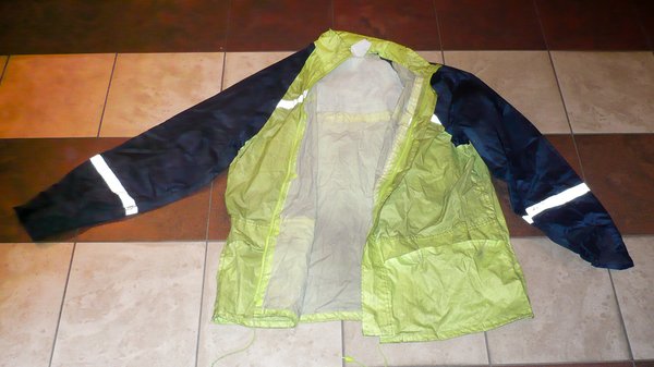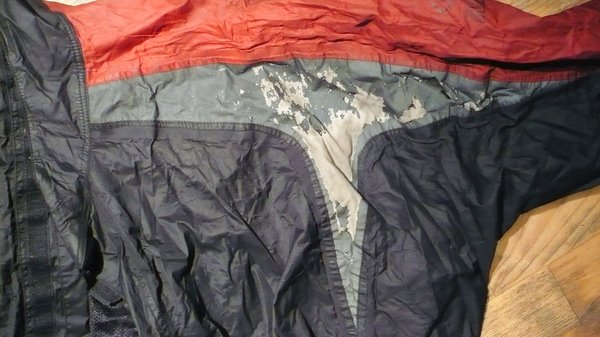 Így néz ki a 6. születésnap annál az amúgy drága és minőségi esőruhánál, amely már első túrámon, a boltban felvéve használhatatlanná vált. A hatórás Budapest-Belgrád túrán zajló folyamatos esőzés annyira betett neki, hogy a szerb fővárosban már inkább esőgyűjtő rongynak volt nevezhető, szó szerint a bőrömig elázva érkeztem meg. Annyiban védett csupán, hogy mivel vastag az anyaga, tökéletesen szigetelt a széltől és a hidegtől, így testmeleg vízben ültem 350 kilométeren keresztül. A későbbiekben a dolog csak romlott, minden impregnáló spray, sőt, WD 40-kezelés ellenére, noha az utóbbi egész jó eredményeket hozott néhány óráig. A futárzsák pántjainak helye már pár hét után sérült, a belső réteg, amelyet gondolom vízzárónak szántak, de nem egészen az, a gyakori fel- és levételektől meg a csizmám súrlódásától indult enyészetnek, először a lábainál és az ágyék tájékán.