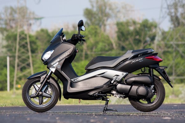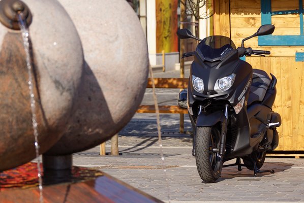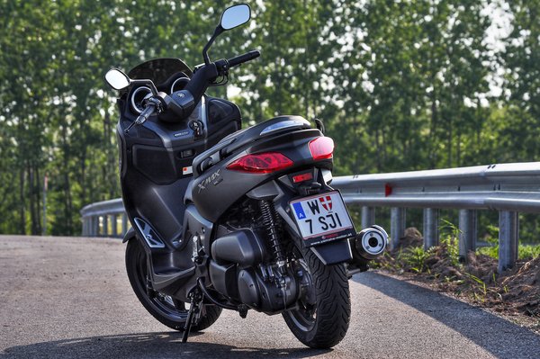 Az X-Max a kiskerék-nagykerék univerzumban is igyekszik középen maradni. Bár látványra kiskerekű-jellegű, de ezt csak azért látjuk így, mert elég testes. Az igazság viszont az, hogy az első kereke 15-ös, a hátsó 14-es, vagyis csak egy-egy collal kisebb, mint a nagykerekűként nyilvántartott Yamaha Y-Cityé, amely egyébként műszakilag is közeli rokona az X-Maxnak.