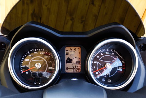 Gondolom a képek alapján nyilvánvaló, hogy a tesztmotor még a meleg időben járt nálunk, időközben Milánóban kiderült, hogy 2014-re kicsit faragtak az X-Max külsején. Ez a verzió a 2013-as Momo Edition, aminek az a specialitása, hogy egyrészt matt fekete-szürke, másrészt minden porcikájára ráírták, hogy Momo. Az ülés is szebb, oldalt és a púpnál velúr hatású betétekkel, a szélvédőt pedig valódi karbon elemek tartják. Az életben nagyon kívánatos, az biztos.