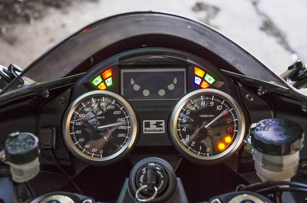 Összességében az egész szerkezet összeszerelése és működése nagyon kulturált, igazi precíz japán mechanika jellemzi. Finomak a terhelésváltások, pontos a váltó, pihe puha a kuplung, a régi Kawák zajos blokkja is a múlté már. A két kerek óra miatt jól áttekinthető műszerfal sokféle adatot képes megjeleníteni. Többek között az átlagfogyasztást is, ami inkább volt nyolc, mint hét liter százon. Az „ECO” mód kijelzést minden bizonnyal viccnek szánták, mert ez majdnem akkora agyrém, mint a start/stop funkcióval ellátott Lamborghini. Takarékoskodni nem azzal a járművel érdemes, ami egy-két ezer km alatt is képes lenyalni egy hátsó gumit.