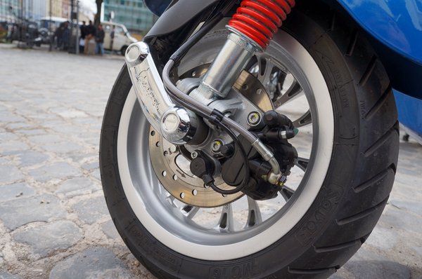 Vicces, hogy a Vespa egészen a közelmúltig ragaszkodott a kretén kerékméretekhez. Amikor mindenki nyolc- meg tízcolban nyomult, ők éppen a kilencesnél tartottak. A kortárs LX-ekre elöl tizenegyes, hátul tízes kerék került, és így jutunk el a máig, amikor végre egy kis-Vespa elöl-hátul tizenkettes kerekeken gurul, mint a nagy, miközben az olcsóbb, Primavera változaton most is tizenegy-tizenegyes van. Az első futómű teljesen átalakult. Ugyan máig féloldalt rögzítik rá a kereket, és nem hagyományos teleszkópvilla vezeti, hanem lengőmechanizmus, de a merevebb váz mellett ezt is sokkal nyugodtabbá tették. Sikerült jobban szétválasztani a fékezéskor és az irányváltáskor ébredő erőhatásokat, és ezzel szinte kioltották a kormányszitálást. A Sprint nem repked olyan eszeveszetten, nem olyan esetleges nagy tempónál sem, de még mindig fürgén fordul.