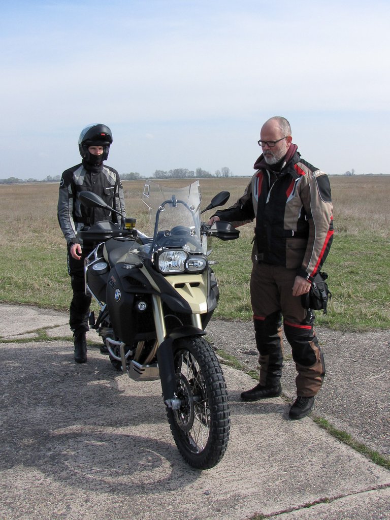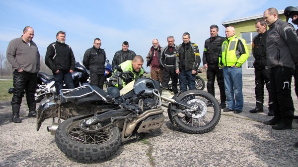 Fel kellett szállni a motorra. Előbb jobbról, aztán balról. Vagy hússzor, egymás után. Míg az ember pipiskedik (mert 185 centi ide, vagy oda, a GS-re nem pattan csak úgy fel az ember), a segítője a motor hátuljánál figyel. Aztán csere, a másik pipiskedik (a partnernek is GS-e volt, csak egy szép nagy tehén boxer), mi meg ügyelünk. Amennyire banálisnak tűnik, annyira nem az: tudták, hogy a motor kormányának hozzánk közelebb eső szárát tőlünk eltolva lehet a legbiztonságosabban felszállni? Lehet, hogy tudat alatt mind így csináljuk, csak még senki nem hívta fel rá a figyelmünket.