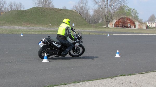 De persze ilyenkor az ember nem bír magával. Hiszen látja, hogy nem képtelenség a motoron állva, fél térddel a nyeregre támaszkodva gurulni. Meg viszonylag szűk ívben kanyarodni. Hiszen az előttem menő is megcsinálja. Meg ha annyira bonyolult lenne, nem mondaná az oktató, hogy tessék csak két térddel a nyeregre pattanni. Pár perc után, ha nem is minden kétségek nélkül, de ott köröztem, mint valami elfuserált századeleji mutatványos. Nem is olyan nehéz ez! A legmegdöbbentőbb az, amikor az ember visszaül a nyeregbe, és észreveszi, mennyivel könnyebben megy a manőverezés az izzasztó bravúroskodás után. Percről percre kicsivel biztosabban kezeli a motort. Persze ennyitől nem lesz senki streetfighter, de érezhető a határozott fejlődés.