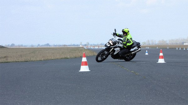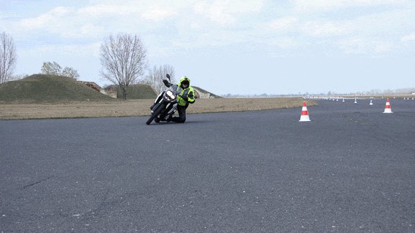 Még itt, a bójakerülgetés elején mutatta meg Tóth Zoli, miért is nem elég a gyors irányváltáshoz pusztán a testsúlyunkat áthelyezni. Hatvan körüli tempónál, elengedett kormánnyal érkezve dőlt a testével jobbra meg balra. Amit a motorja készségesen követett is, de csak mint ha egy nyúlós gumipertlivel rángatnák. Aztán ugyanígy, elengedett kormánnyal motorozva csak egyet-egyet bökött a markolatokon. A hétköznapi logikával teljesen szembe menve a motor mindig abba az irányba tört ki, de egészen hirtelen, amelyik kormányvégre ráütött. Tehát a másik irányba, mint amerre a kormány fordult. Elég látványos demonstrációja ez az ellenkormányzásos technikának.