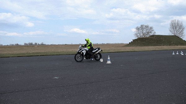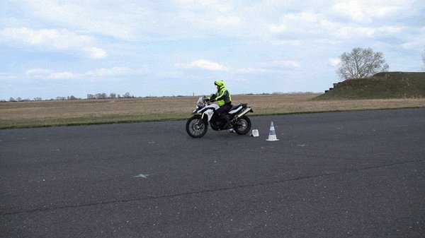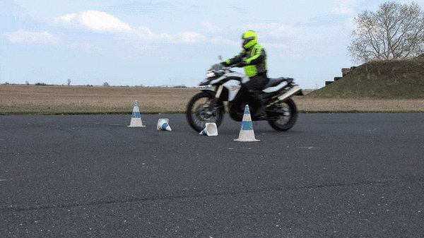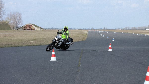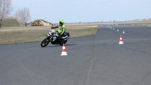 A gyors szlalomozás meg már tényleg igazi élmény, helyesen megválasztott sebességi fokozatban, jó ütemben döntögetve nem tartott sokáig, hogy a hosszú lábú GS középsztenderével karcoljam a betont. Ilyenkor persze minden alkalommal kicsit összecsináltam magam, mert azért nincs az ember ilyesmihez szokva. Annyira jólesett a bóják közti cikázás, hogy nem túlzás azt állítanom, akár estig elszlalomozgattam volna. Nagyon tanulságos tud lenni, ha ilyenkor közben elemezgeti az ember, mi miért történt, hol lehetne kicsit ügyesebb, hogyan lehetne még szebb a lassú szlalomja, még jobb a gyors szlalomja. És hogy baromira oda kellene már figyelni a lábtartásra, mert Zoli már a legelején elmondta, hogy a lábtartón nem a talpunk van, hanem szinte csak lábujjhegyünkkel érintjük. Ugyanis, amikor a motort mélyre döntjük, és a lábtartóhoz nagyon közel kerül a talaj, simán beszorulhat a lábfejünk a lábtartó és az aszfalt közé. Az meg nem igazán egészséges.