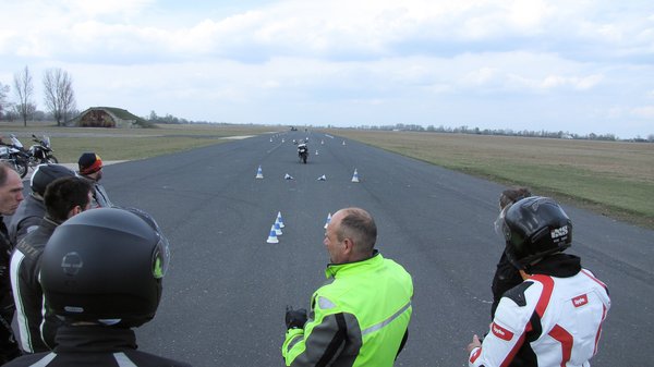 De az ilyen továbbképzéseket profik tartják, akik mindent megtesznek, hogy mindenki pozitív élményekkel és sok új tudással menjen haza, ezért úgy is vannak ezek a tréningek felépítve, hogy csak szélsőséges esetben fordulhasson elő, hogy valaki eldobja a motort. Mindenki megkapja a visszajelzéseket, mit és hol csinál rosszul vagy jól, és tényleg sokszor elhangzik: csak azt csinálja az ember, amivel érzi, még elbír. Olyan sebességről kezdjen vészfékezni, amit még nem tart ijesztőnek, és ha úgy érzi, nem fog sikerülni, inkább menjen át a speciális bójákon -nem fog elesni, a kis kék-fehér kúpok tapadós gumiból készültek, semmiféle veszélyt nem jelentenek.