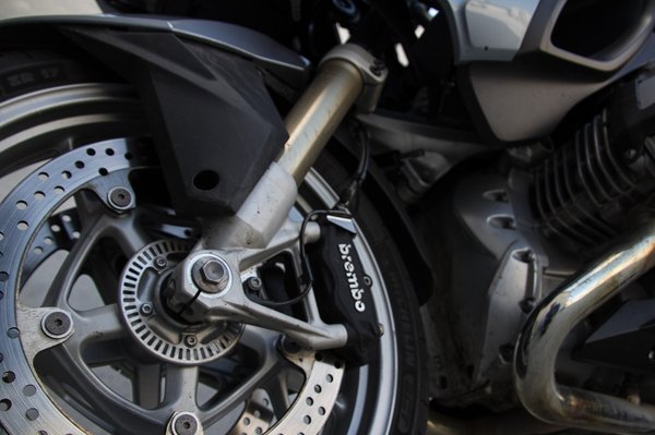 Néhány év motorozás után nagyjából számítógépek nélkül is sejtheti a felhasználó, hogy csúszós időben illik visszavenni a tempóból, de nagy biztonságérzetet ad az összehangolt rendszer, amely szinte észrevétlenül működik. A lassításban elöl vadonatúj Brembo radiális fékek segítenek, nagyon hamar megfogják a 274 kilót, pofátlanul rövid féktávokat lehet vele venni, bár a 2004 után gyártott BMW motorok fékei is jók.