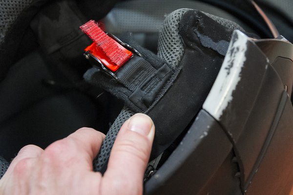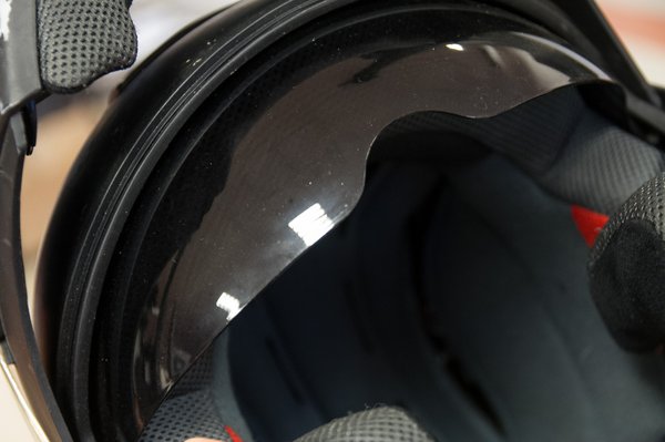 Aztán egyszer kivettem a belsejét, hogy kimossam. Na, akkor az arcrész párnájának kipattintása közben az a szivacsos izé, aminek a bukóban kellett volna maradnia, kijött a párnával. Mivel ez a rész épp a szíjban van, ezért a szíjon lógott, de végül is nem esett, és azóta sem esik ki belőle.
