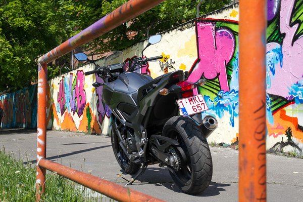 Márpedig elmélázásra nagyon alkalmas az NC, egy végletesen jámbor teremtmény, megijeszteni senkit nem fog. A koncepció tökéletes kivitelezésében egyedül a kissé keménykedő első futóművét lehet felhozni hibaként, de azt is valószínűleg a csekély, 75 kilós súlyom miatt éreztem sprődnek. Állítani mindenesetre nem lehet rajta, és így aztán nagyobb tempónál minden úthibán elkezdett rúgkapálni, mintha ki akarna ugrani alólam. Persze ez csak költői túlzás, de az teljesen egyértelmű, hogy nem ez 2014 legkifinomultabb futóműve. Teszi a dolgát, lehet vele kanyarodni is, de nem ezzel fogjuk megjavítani egyéni csúcsunkat a visegrádi szerpentinen. Igazából nem is fogjuk akarni, mert két merészebb kísérleti döntés után inkább visszaállunk a békés ingázótempóra.