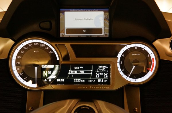 A K 1600 GTL Exclusive-en van pár új fícsör. Ilyen a már említett fényezés, a kulcs nélküli rendszer, a fűthető háttámla, aztán van még LED-es nappali menetfény, krómozott biszbaszok, meg egy autókból már ismerős extra, a lejtőn való visszagurulást meggátló, elindulást segítő Hill Start Controll. Csak meg kell húzni egyszer, erősen az első féket, és addig fogja a rendszer a motort, míg még egyszer meg nem húzzuk a fékkart, vagy meg nem próbálunk elindulni. Új még a műszerfal is, új funkciókat tettek rá és a megjelenése is változott. Ami azt illeti, ezt a dizájnt már az RT-n sem szerettem, mert bármennyire is mutatós, este kimondottan zavaró, hogy a műszerfal legfényesebb része a két nagy, fehéren világító karika, ezek elnyomják a számok és a mutatók fényét. Zavaróak az LCD-panel fekete alapon fehér karakterei is, tipográfiai alapvetés, hogy a fehér alapon feketével megjelenített szöveg könnyebben, gyorsabban értelmezhető. Márpedig információból van bőséggel.